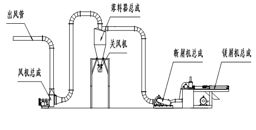 YMX-300A型液壓鎂屑機(全自動液壓鎂屑機、鎂屑斷屑機、碎屑機、鎂粉造粒機、鎂粉磨機)由鎂屑機、斷屑機、風機、液壓站、落料器、配電柜六部分組成(如下圖)。